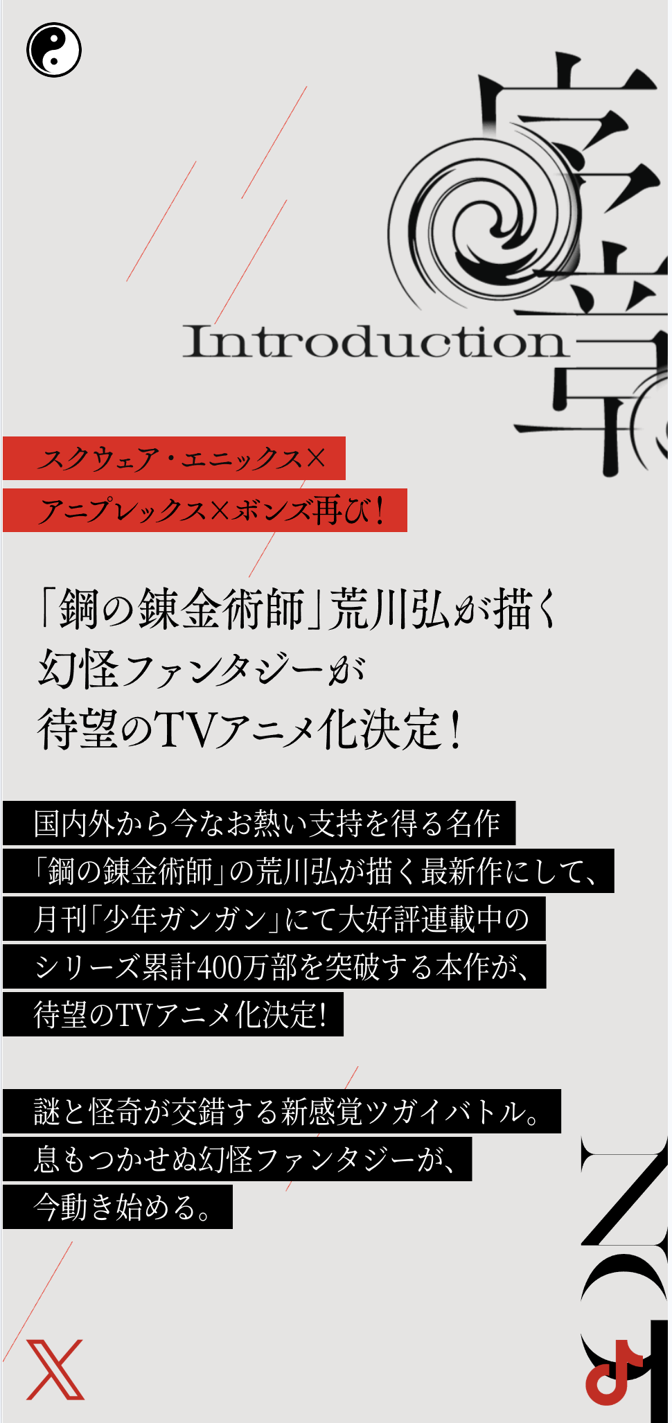 黄泉のツガイ 公式サイト Year 2025 Media Website Service Art Direction Design Development Launch Site > Client : 株式会社アニプレックス ©Hiromu Arakawa/SQUARE ENIX, Project TSUGAI ※公開していない作品も多くございます。 こちらからジャンルなど指定の上、閲覧希望とお送りください。